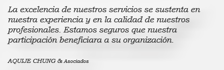 Nuestra Organización Desde el año 1989 nuestra Firma AQUIJE CHUNG & ASOCIADOS viene prestando sus servicios profesionales en el Perú ...